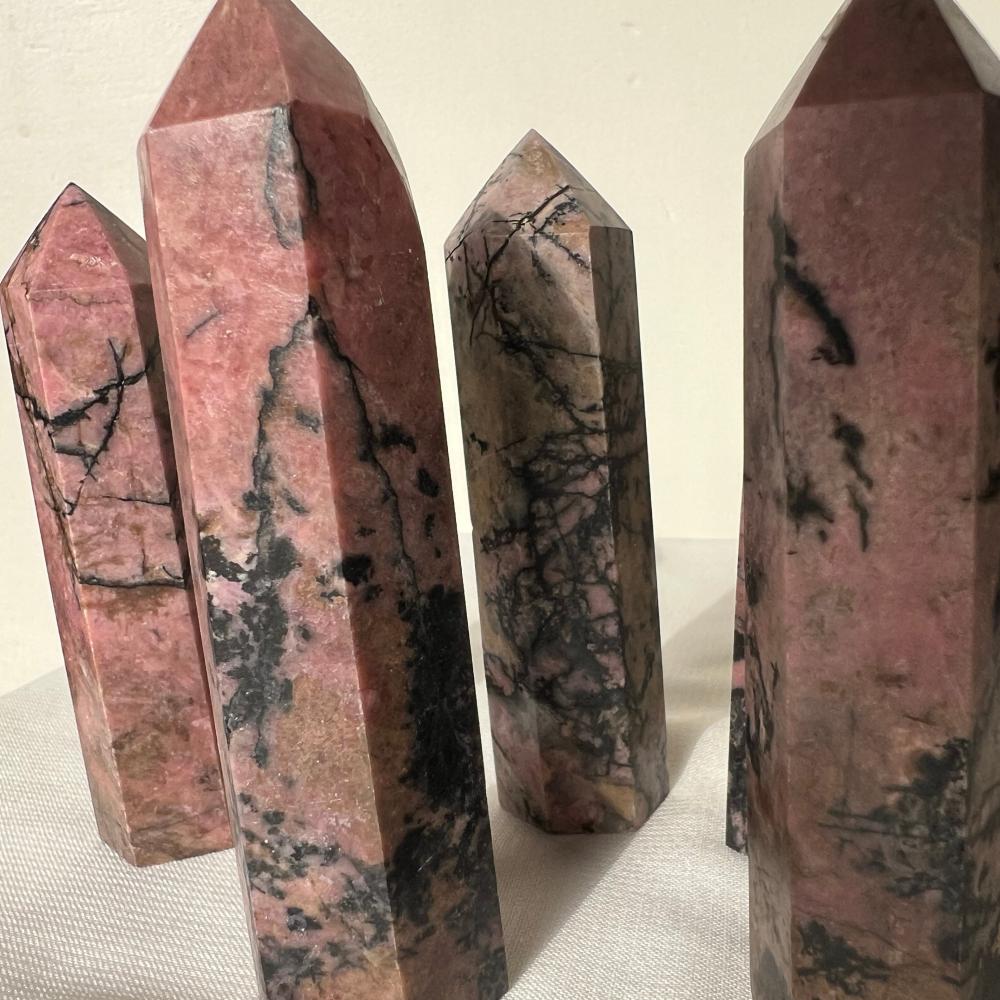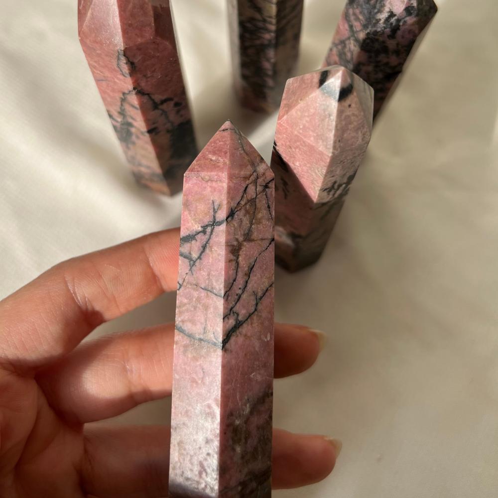 يتميز برج رودونايت بلونه الوردي الفاتح مع خطوط داكنة تضفي عليه طابعًا فريدًا، ويُعتقد أنه يعزز الشفاء العاطفي والتوازن الداخلي. تم صقله بعناية ليُظهر جماله الطبيعي ويضيف لمسة مميزة لأي مساحة.