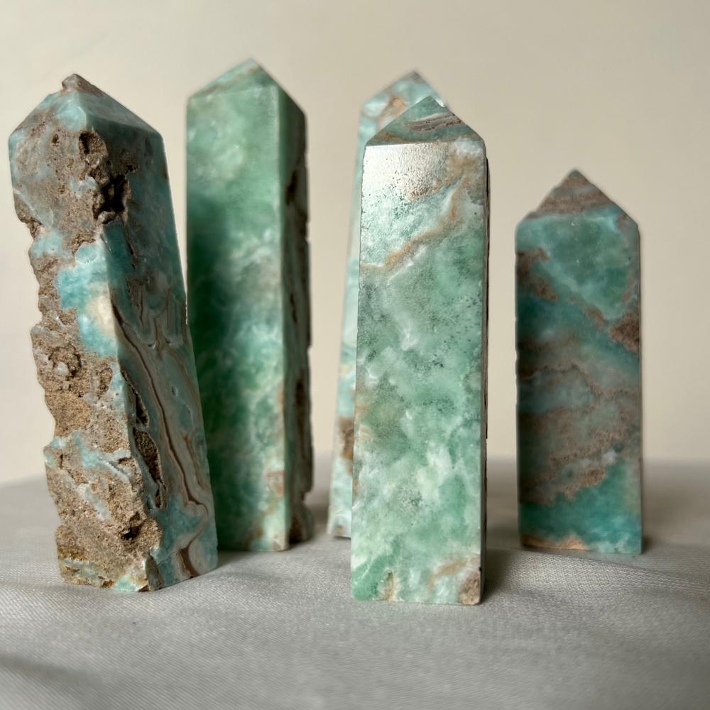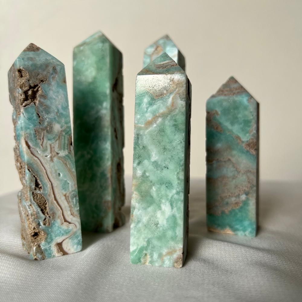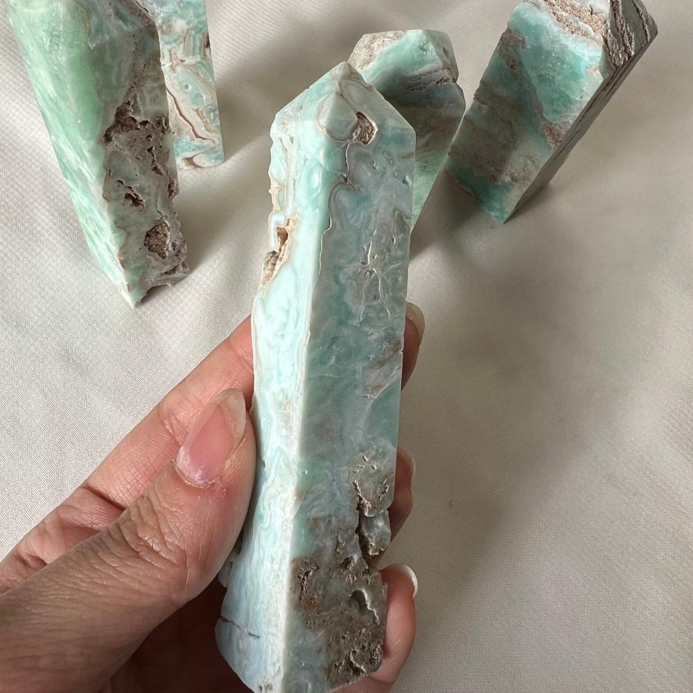 برج هيميمورفيت يتميز بلونه الأزرق الفاتح والأخضر، ويُعتقد أنه يساعد في تعزيز التواصل الداخلي والتوازن العاطفي. تم صقله بعناية ليوضح جماله الطبيعي ويُضيف طاقة مهدئة وملهمة لأي مكان.