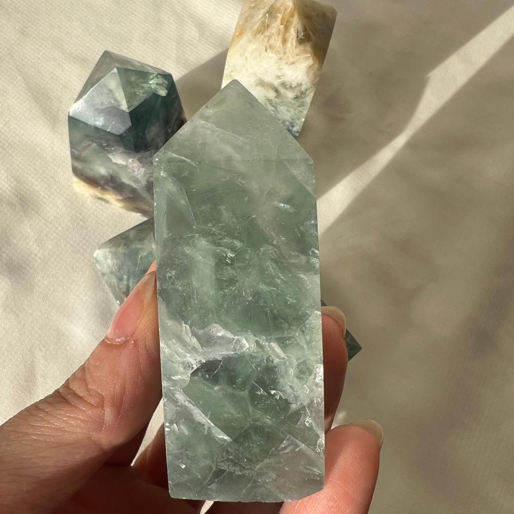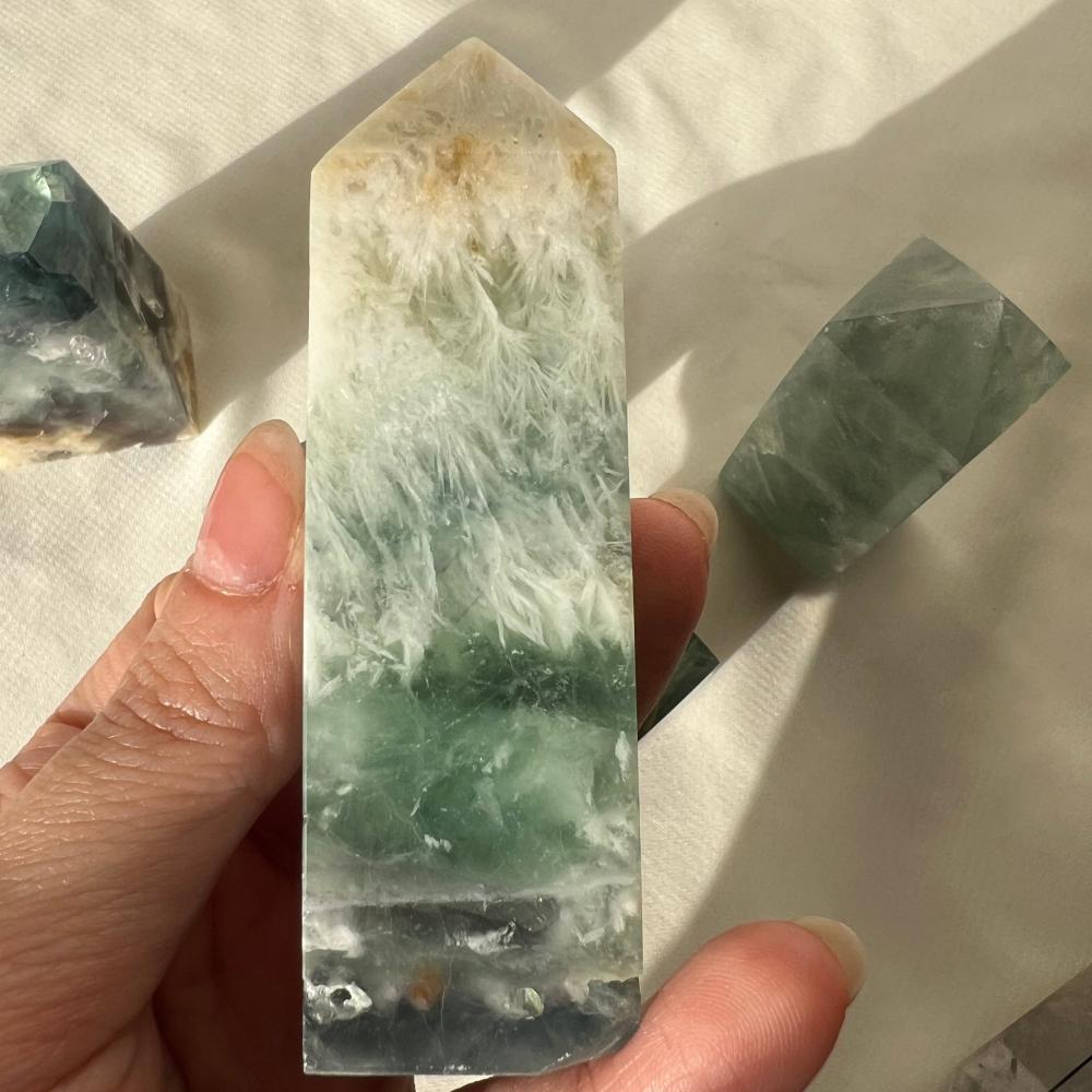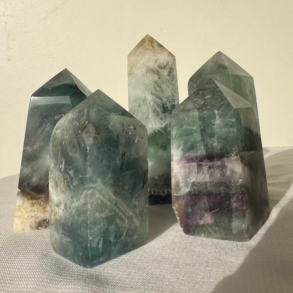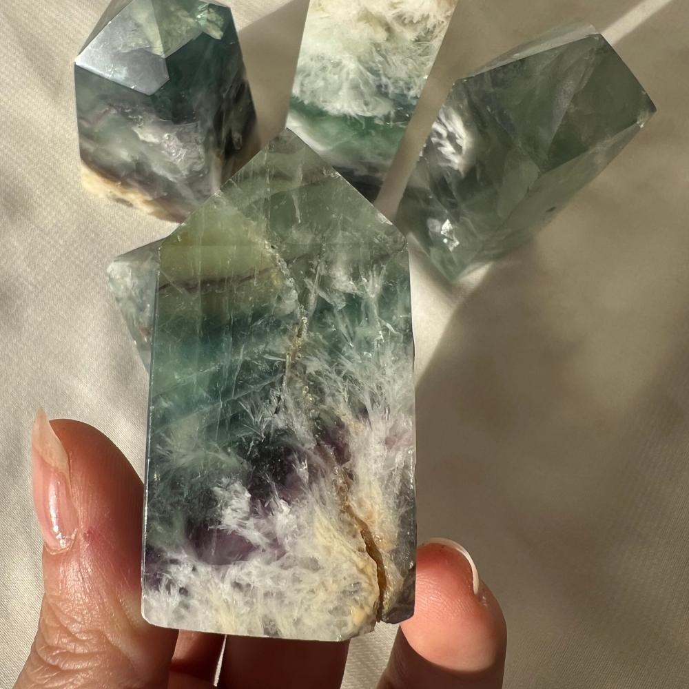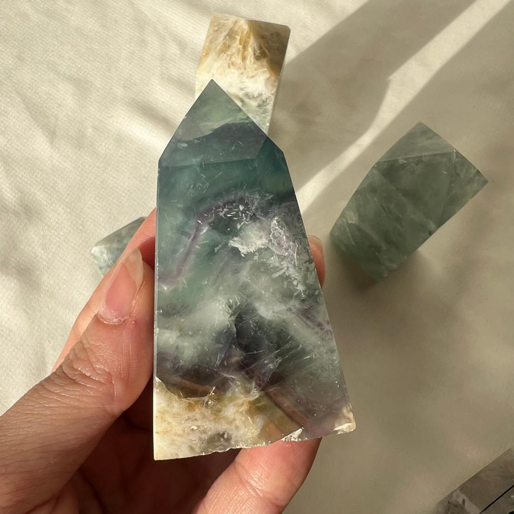 يتميز برج الرينبو فلورايت بتدرجاته اللونية الساحرة بين الأخضر والبنفسجي والأزرق، ويُعتقد أنه يعزز التركيز ويجلب صفاء الذهن. تم صقل هذا البرج بعناية ليضفي طاقة مبهجة ومريحة على أي مساحة.