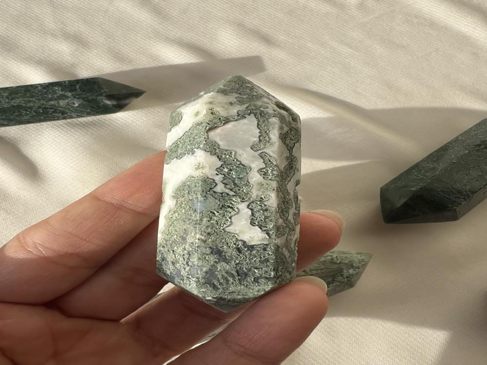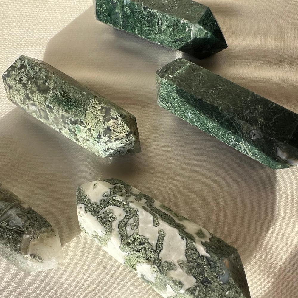 كريستال عقيق طحلبي ذو الطرفين يتميز بتدرجات لونه الأخضر مع لمسات من الألوان الطبيعية الأخرى، مما يُعتقد أنه يعزز النمو الشخصي والتوازن الطبيعي. تم صقله بعناية ليوضح جماله الفريد ويوفر طاقة إيجابية تُضفي لمسة من الطبيعة على أي مكان.