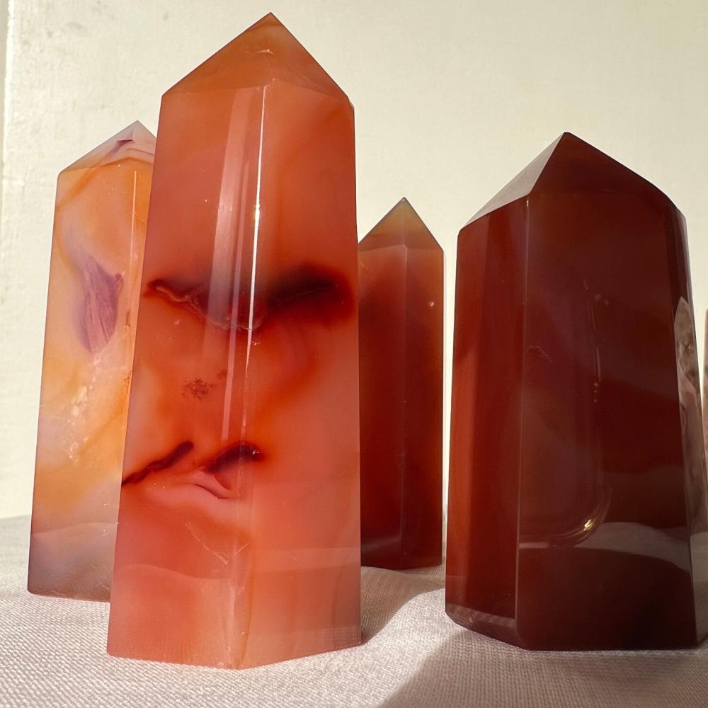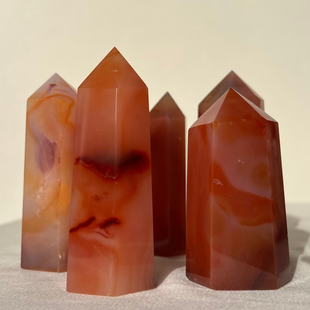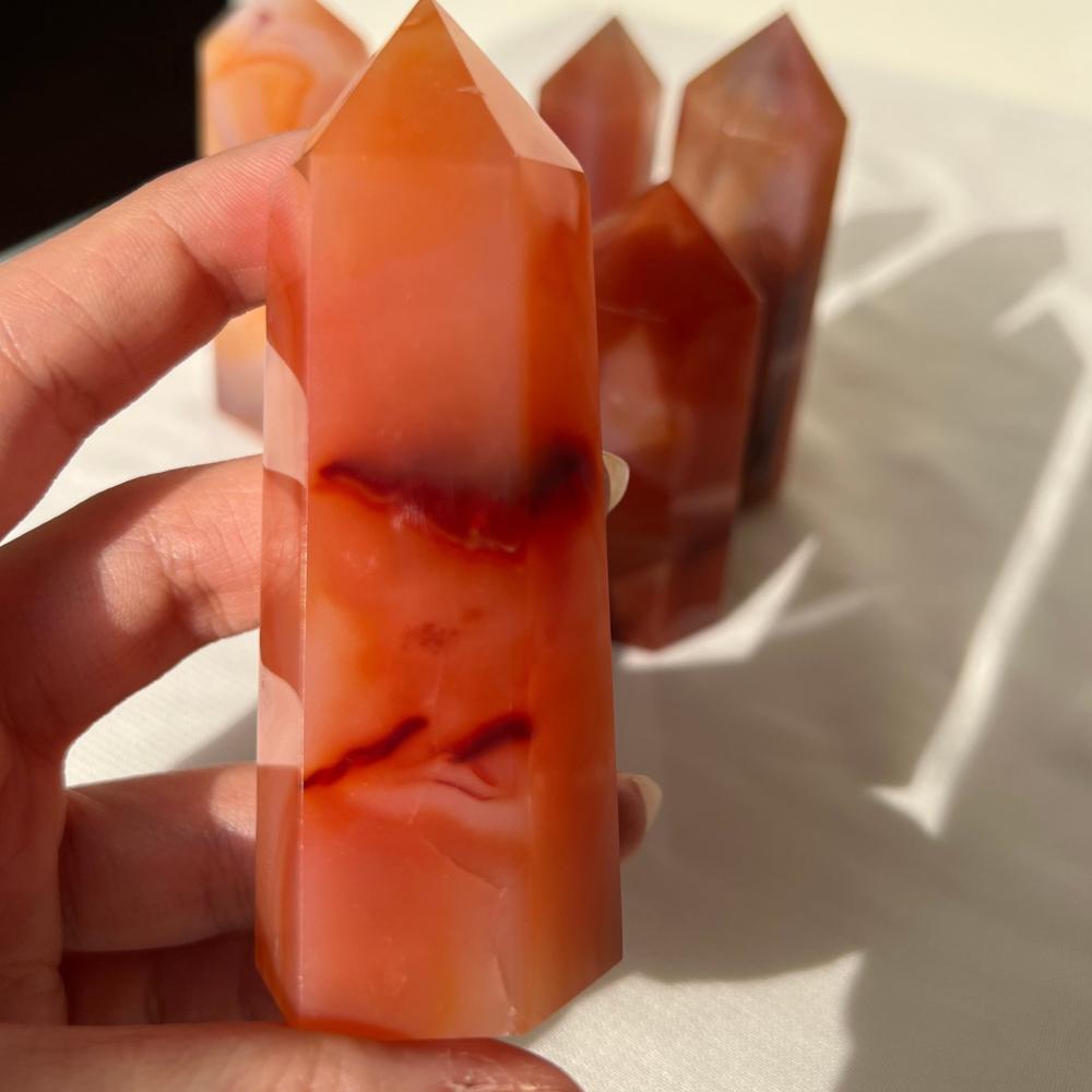 برج كارنيليان يتميز بلونه البرتقالي الدافئ مع تدرجات الأحمر المشرقة، ويُعتقد أنه يعزز الطاقة الحيوية ويحفز الإبداع والثقة بالنفس. تم صقله بعناية ليُظهر جماله الطبيعي ويُضفي لمسة مشرقة على أي مكان.
